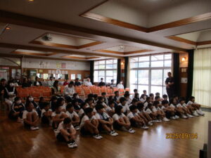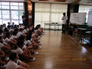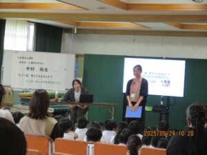 9月24日3限目、人権講演会がありました。今年度のテーマは、SNS。.反差別・人権研究所の中村尚生さんに来ていただきました。ゲームやSNSは絶対いけないというものではなく、うまく付き合うことが大切という話を聞かせていただきました。「自分のしたいこと」を優先すると、「自分の気持ちが抑えられなくなる」それこそが「依存(いぞん)」であること。そうなると、無意識に相手を傷つける言葉を言ってしまうので、どういう言葉なら友だちは喜んでくれるかな、どういう言葉なら友だちは傷つかないのかなと考えていくことはとても大切だということを教えていただきました。子どもたちは、中村さんのお話に引き込まれ、笑いもありつつ、真剣に聞き、受け止めた子どもたちでした。