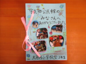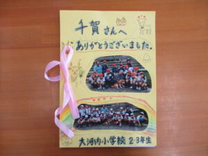 10月3日、2・3年生が宇気郷へ校外学習に出かけました。毎年、宇気郷公民館と、ジップラインの林さん、ヤギの千賀さんのところへ行かせてもらっています。大河内の校区はとても広いです。そして、魅力的なところがたくさんあります。行きはタクシーで宇気郷までいくのも、楽しみの一つです。今年はジップラインはできなかったのですが、その分千賀さんのところでたっぷり時間がもてて、ヤギに餌やり体験をさせてもらったり、飼っているかわいい柴犬と触れ合ったり、子どもたちは大満足でした。最後に宇気郷公民館に行き、中尾館長に竹細工の肩たたきを作らせていただきました。柚原小学校の跡地となる運動場(現駐車場)では、50メートル競走をして元気に遊んだ子どもたちです。お忙しい中、子どもたちのためにたくさん準備していただき、本当にありがとうございました。