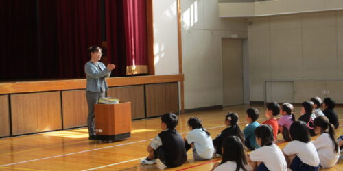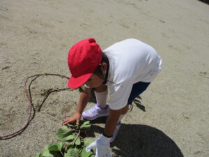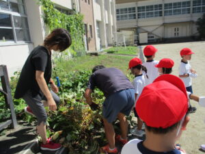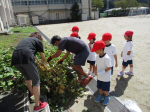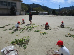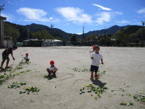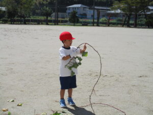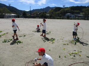 10月6日、1年生が育てているサツマイモのつるを使ってリースづくりに挑戦しました。なるべく長いつるを探し出し、葉をちぎり取って、軸だけにします。それを3重の輪にして端を入れ込み、ほどけて来ないようにします。自分の身長の5倍くらいある長いつるをまくのはとても大変。でも、子どもたちはあきらめずに頑張りました。