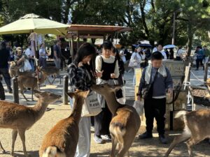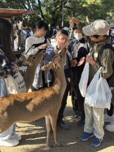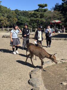 先生から鹿せんべいをもらうと、鹿の餌付け体験となりました。鹿せんべいほしさに擦り寄ってくる鹿をなんとかかわしながら、鹿に餌をあげる子、かわせなくて、鹿に餌を投げてしまう子、鹿から催促されて鼻でつつかれる子など、様々でした。鹿の鳴き声なのか、子どもたちの悲鳴なのかわからない甲高い声が響き渡りました。おとなしい鹿の背中を撫でて癒されている子もいて、とっても楽しそうでした。