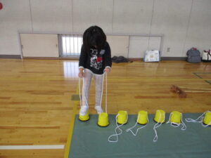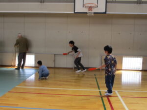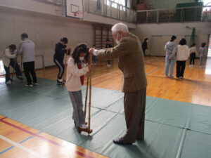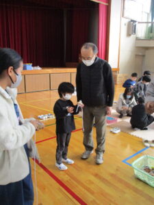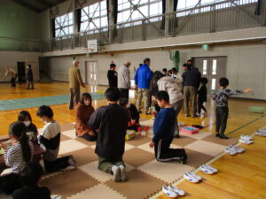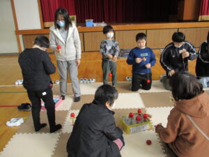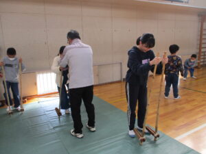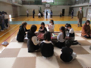11月28日、大河内地区の民生委員さんや児童委員さんに来ていただき、昔の遊び集会がありました。大河内地区住民自治協議会さんにお世話になり、10年近く毎年行っている行事です。今日も地域の昔遊びのプロがたくさん集結し、けん玉、めんこ、コマ回し、お手玉、ゴム鉄砲、長縄、竹馬、缶ぽっくり、羽子板など、たくさんの昔から伝わる伝承遊びを教えていただきました。最近はこのような遊びはしていない子どもが多く、こまを回すのに、そもそも紐がうまく巻けなくてなかなか苦労している子が多かったです。また、竹馬は重心を考えて、前のめりになって乗るとうまくいくのですが、竹を斜めに倒すのが怖いのか、バランスをうまく取れず、すぐに落ちてしまっていました。でも、みんな笑顔いっぱい!1年生と2年生で行うところ、急遽、6年生も参加してもらいました。優しいお兄さんお姉さんと一緒に遊ぶ姿はとてもほほえましかったです。お越しくださった地域のみなさま、子どもたちのためにいろいろ準備もしていただき、本当にありがとうございました。
