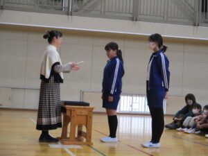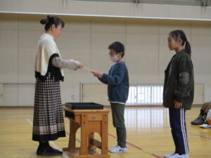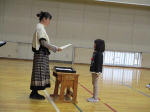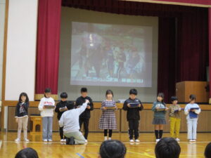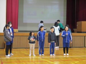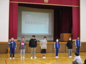 12月に入りました。12月3日の集会では、2年生の発表、図書委員会の発表、11月のお誕生日会、伝達表彰をしました。2年生の発表は、公民館や郵便局に見学に行って気づいたことを調べ学習した内容で発表し、最後に今頑張っている九九を唱えてくれました。図書委員会の発表では、自分の「推し」の本を紹介してくれました。おすすめポイントをわかりやすく伝えてくれました。お誕生会では、11月生まれの友だちが紹介されました。
