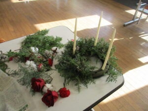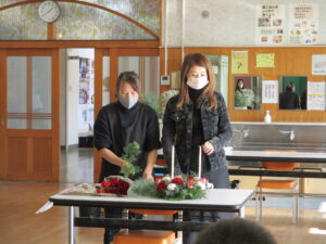12月5日、大河内地区住民自治協議会のイベントで、地域の福祉施設に贈るフラワーアレンジメント作りがありました。今年はテーブルに置く形のリース作りです、初めに挨拶があり、作り方を聞きながら2人1組で進めていきました。好きな色のろうそく、オーナメントを選び、スギの葉を切り落として円周に沿ってオアシスに枝をきれいに指していきます。スギのいい香りがランチルームいっぱいに広がりました。どんな風に仕上がるのか、とても楽しみです。出来上がったら、一つは近くのエスペランサ笹川さんに届けに行きました。喜んでいただけたら嬉しいですね。