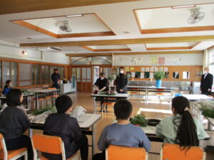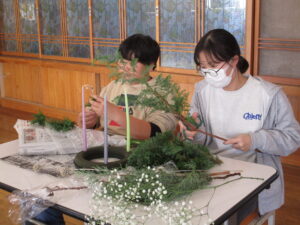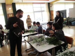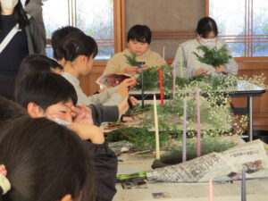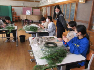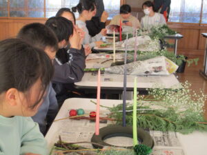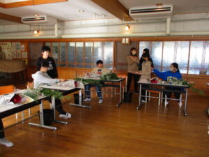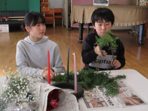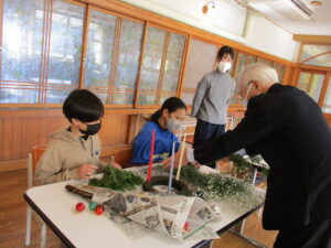 12月5日、大河内地区住民自治協議会のイベントで、地域の福祉施設に贈るフラワーアレンジメント作りがありました。今年はテーブルに置く形のリース作りです、初めに挨拶があり、作り方を聞きながら2人1組で進めていきました。好きな色のろうそく、オーナメントを選び、スギの葉を切り落として円周に沿ってオアシスに枝をきれいに指していきます。スギのいい香りがランチルームいっぱいに広がりました。どんな風に仕上がるのか、とても楽しみです。出来上がったら、一つは近くのエスペランサ笹川さんに届けに行きました。喜んでいただけたら嬉しいですね。