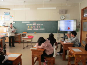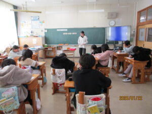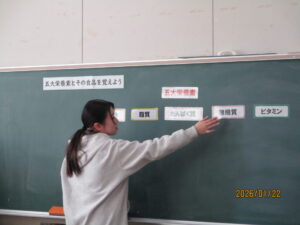 1月22日、原田先生が来校され、5年生に食育の授業をしてくださいました。今日の学びは五大栄養素についてでした。プリントに知っている栄養素の名前を書き込み、どんな働きがあるかを学んでいきました。「しっとる」、「きいたことある」と日頃の知識を駆使しながら、栄養素について学んでいました。