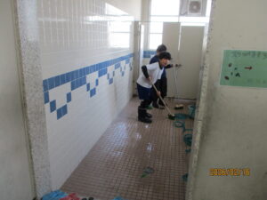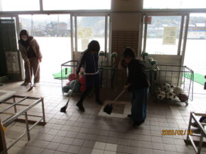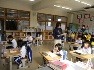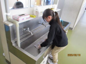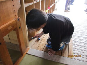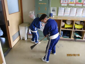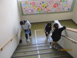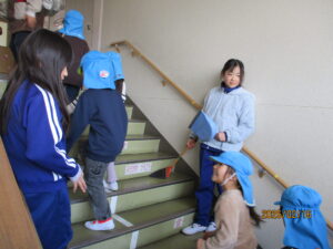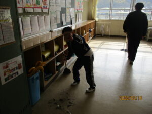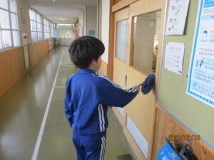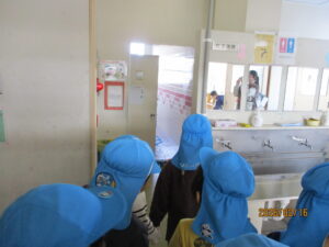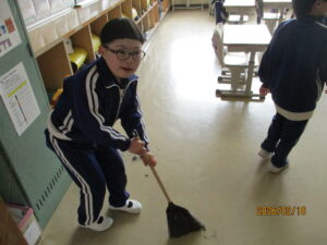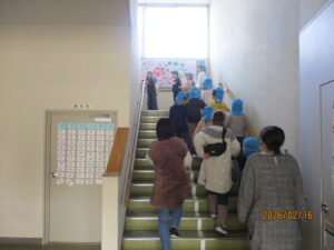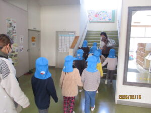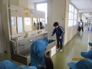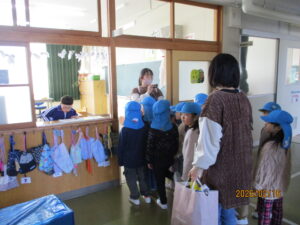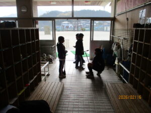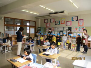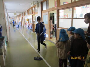2月16日、大河内保育園のぞう組さんが小学校に来てくれました。一回目はドッジボール、2回目はオセロ、今回は3回目です。掃除の時間に合わせてきてもらい、小学生がお掃除をしている様子を見学していました。ダスキンさんのモップを使って上手に掃除している姿を見たり、昇降口をほうきで掃く子を見たり、ホースを使ってトイレ掃除をしている姿を見たりしました。その後、1年生が国語の授業で音読をしている様子を参観してもらいました。1年生の子どもたちは、年長さんたちにかっこいいところをみてもらおうと張り切っていました。4月に入学してくれるのを楽しみにして待っていますね。