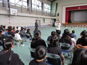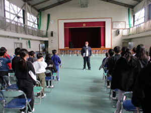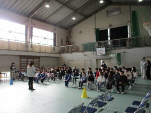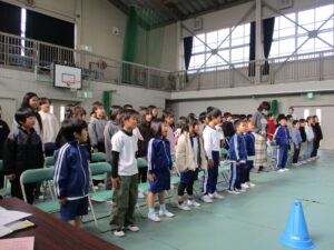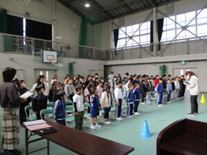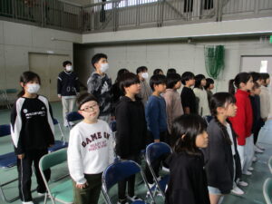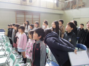 在校生も卒業式の練習が始まりました。練習の前に、式の間の座り方や礼の仕方、トイレに行きたくなったときや、体調が悪くなった時の対応の仕方について先生から話を聞きました。これまで子どもたちは各教室でよびかけの練習をしてきましたが、今日は初めて1~5年生で通してやってみました。初めてとは思えないくらい、大きな声で呼びかけができていましたので、卒業式に向かう気持ちの表れなのかなと思い嬉しくなりました。歌もいい声が出ていました。これからもっともっと練習して、気持ちを声に乗せて、最高の卒業式にしていってほしいと思いました。