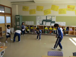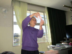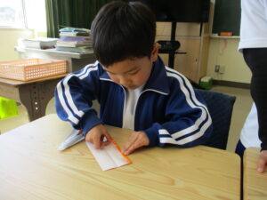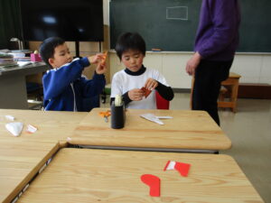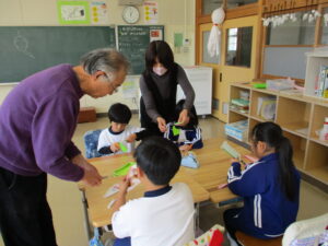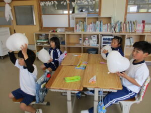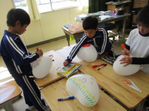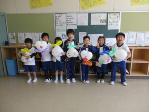 3月16日、三重大学の加藤進先生が1年生の子どもたちに楽しい工作の出前授業をしてくださいました。風船を使って、「おばけふうせん」を作ろうという内容で、膨らませた風船に思い思いの絵を描き、あっという間に出来上がりました。教室の後ろで飛ばすと楽しく、子どもたちの笑い声が響き合いました。その後、折り紙で「もみじの種」を作りました。1枚の折り紙をごみを出さずに作るという、とてもサスティナブルな工作でした。もみじは動物や昆虫と違って、自分で移動できない。だから風に乗って遠くまで行ける形になり、遠い場所に根付くんだよ、と教えていただきました。1年生の子どもたちの心に残ってくれるといいなと感じました。